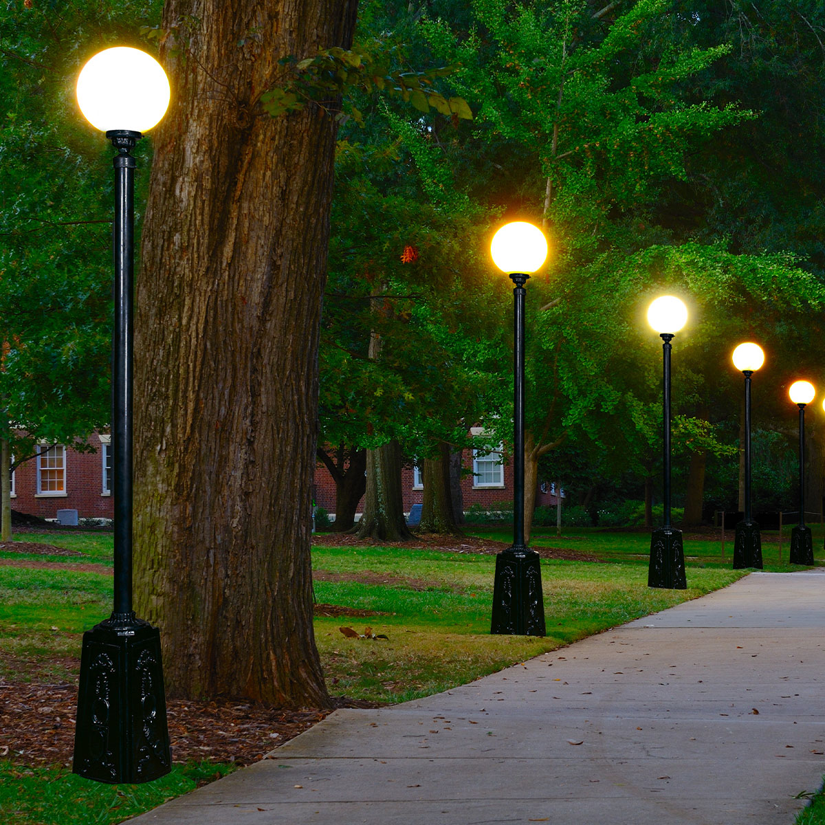 Poste con globo y base color negro de aluminio y acero. Hecho en México.
