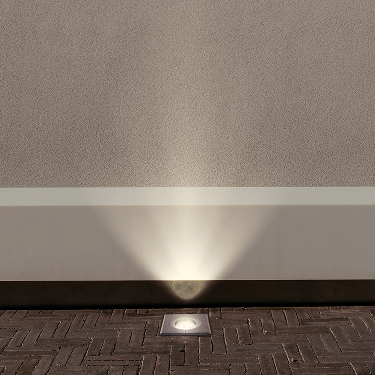 Luminaria para empotrar en pisos de ambientes en exterior, material de acero inoxidable.