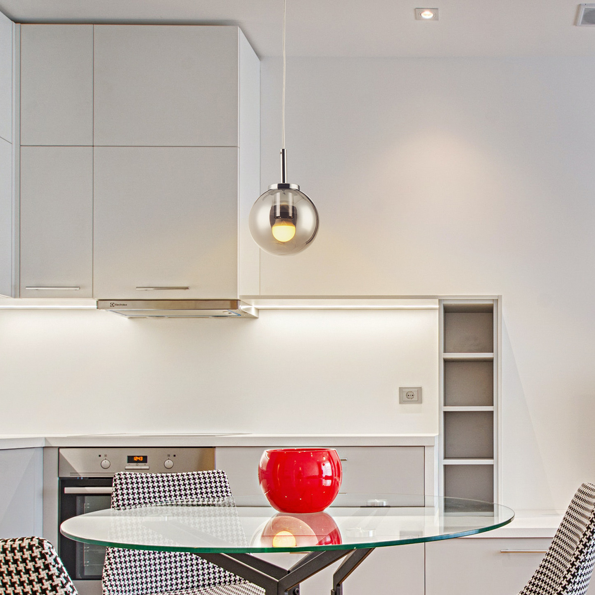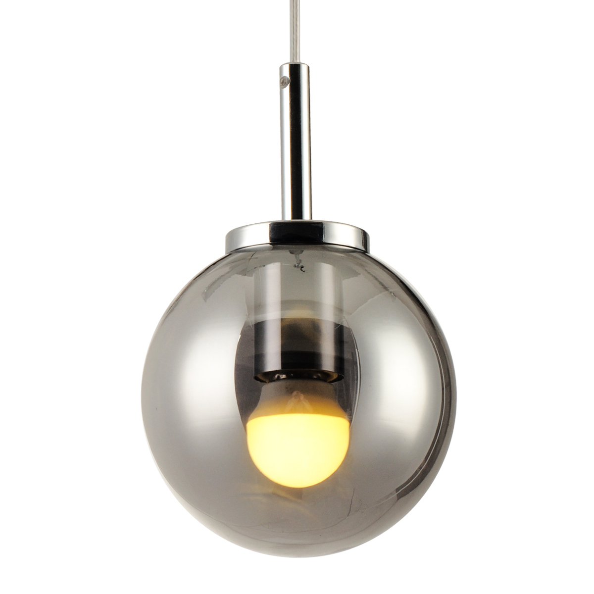 Lámpara colgante cromada con globo de cristal color humo.