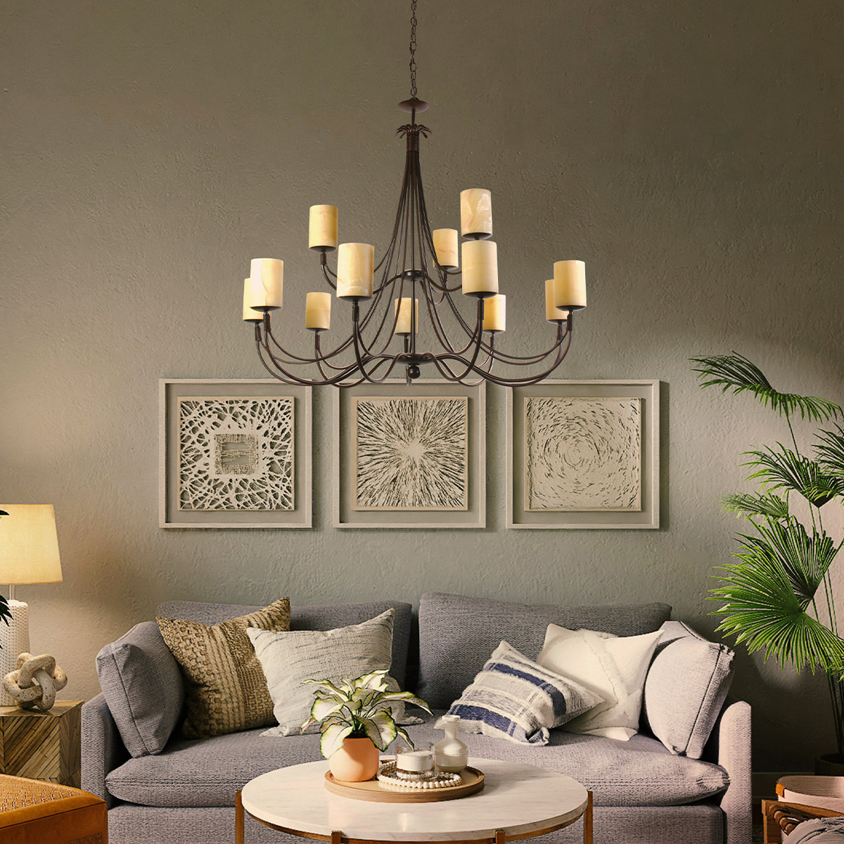 Candil espectacular grande de 12 luces color oxido con pantallas de onix natural.