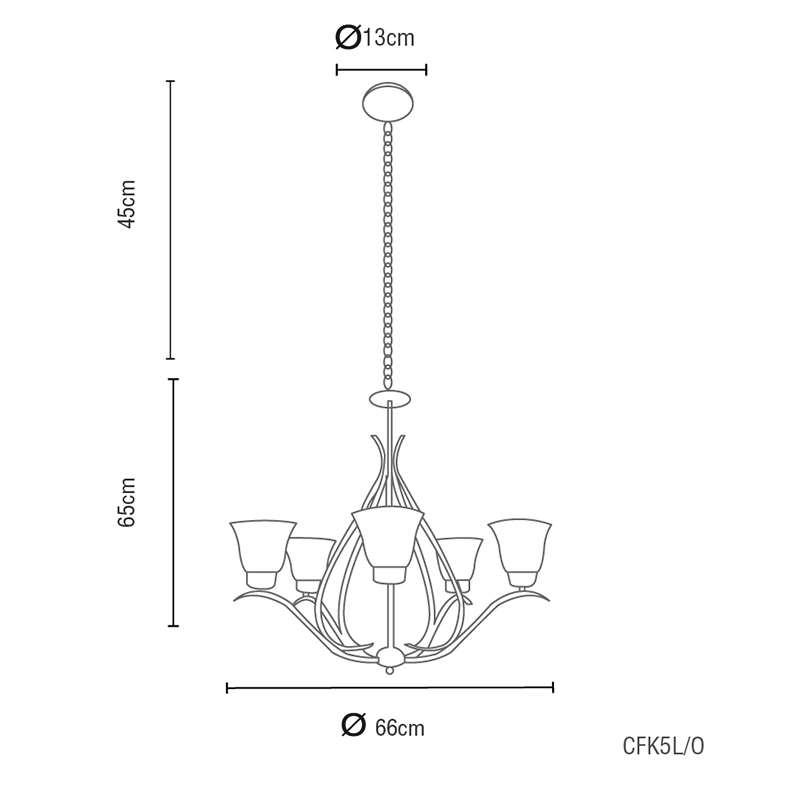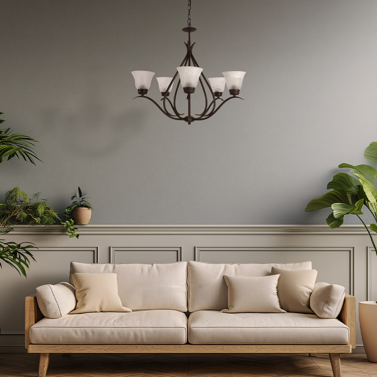 Lámpara candil de 5 luces de color oxido y pantallas de cristal.